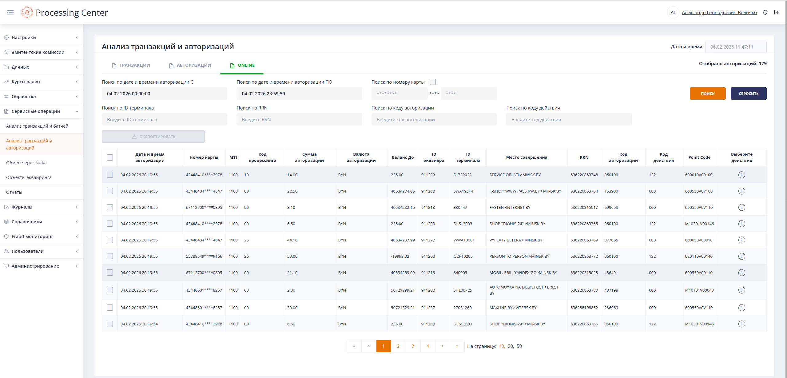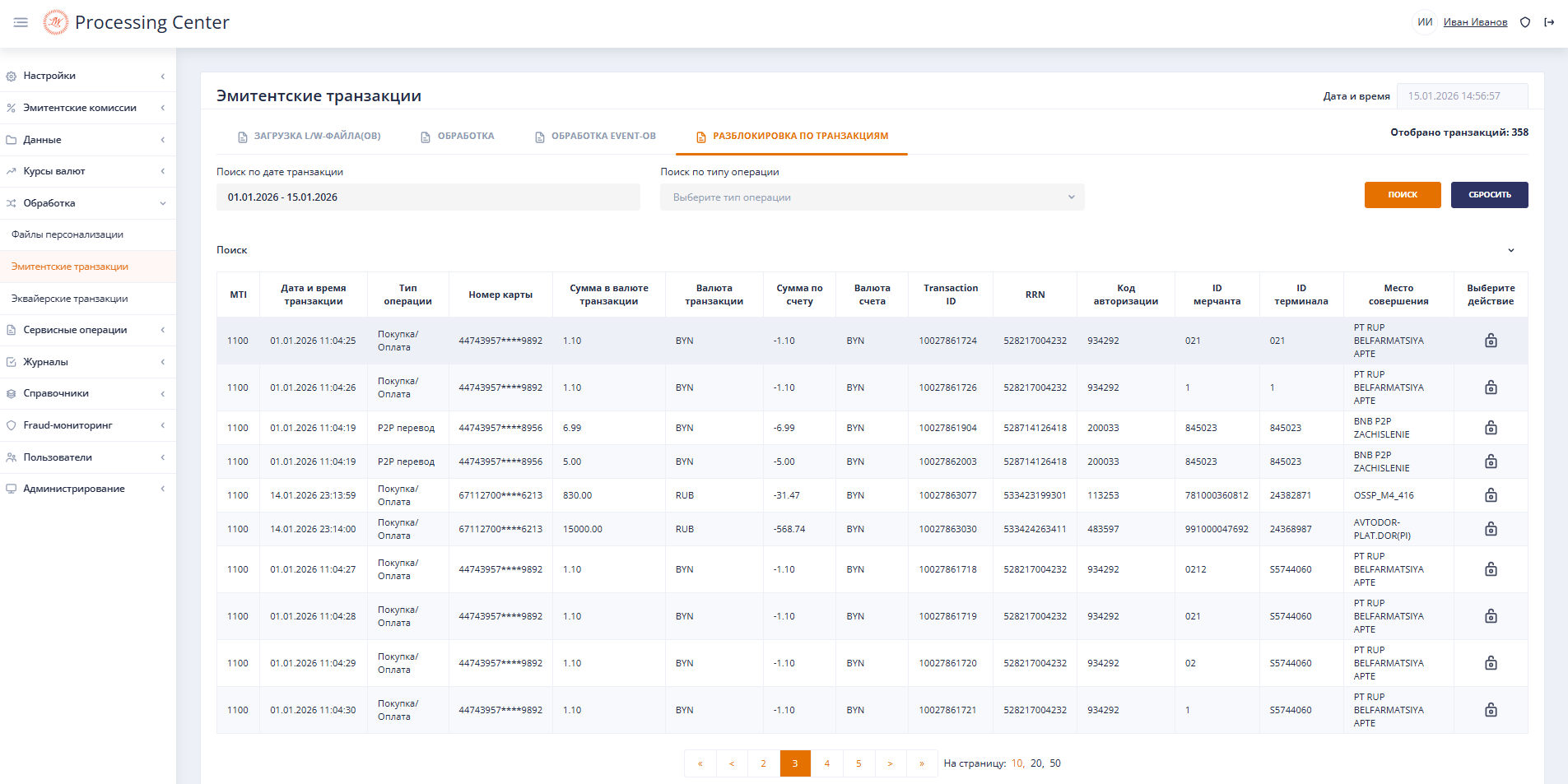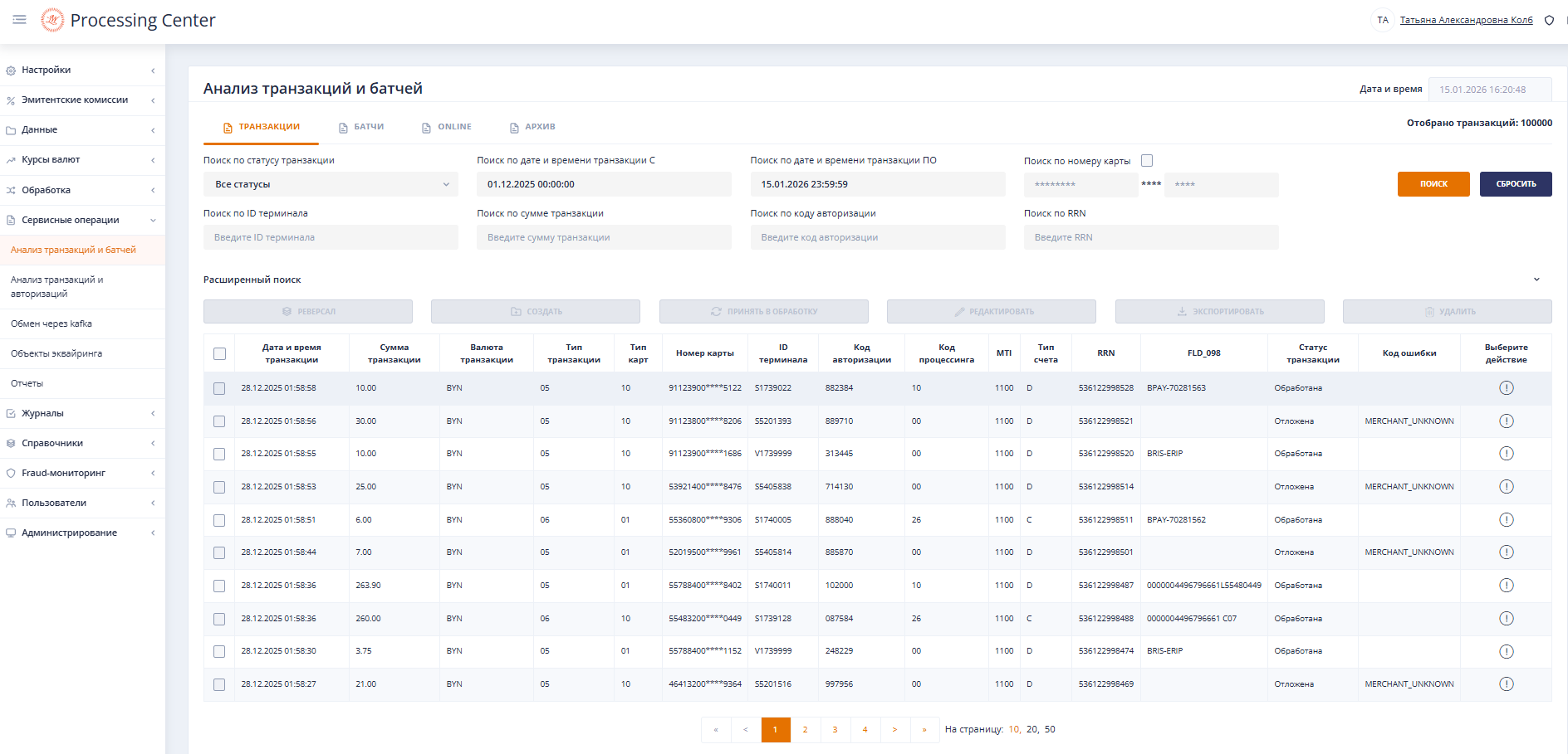 Полный цикл обработки эквайерских транзакций с автоматической подготовкой данных для клиринга и последующих расчетов. Анализ, управление транзакциями и батчами (создание реверсалов, корректировки)
