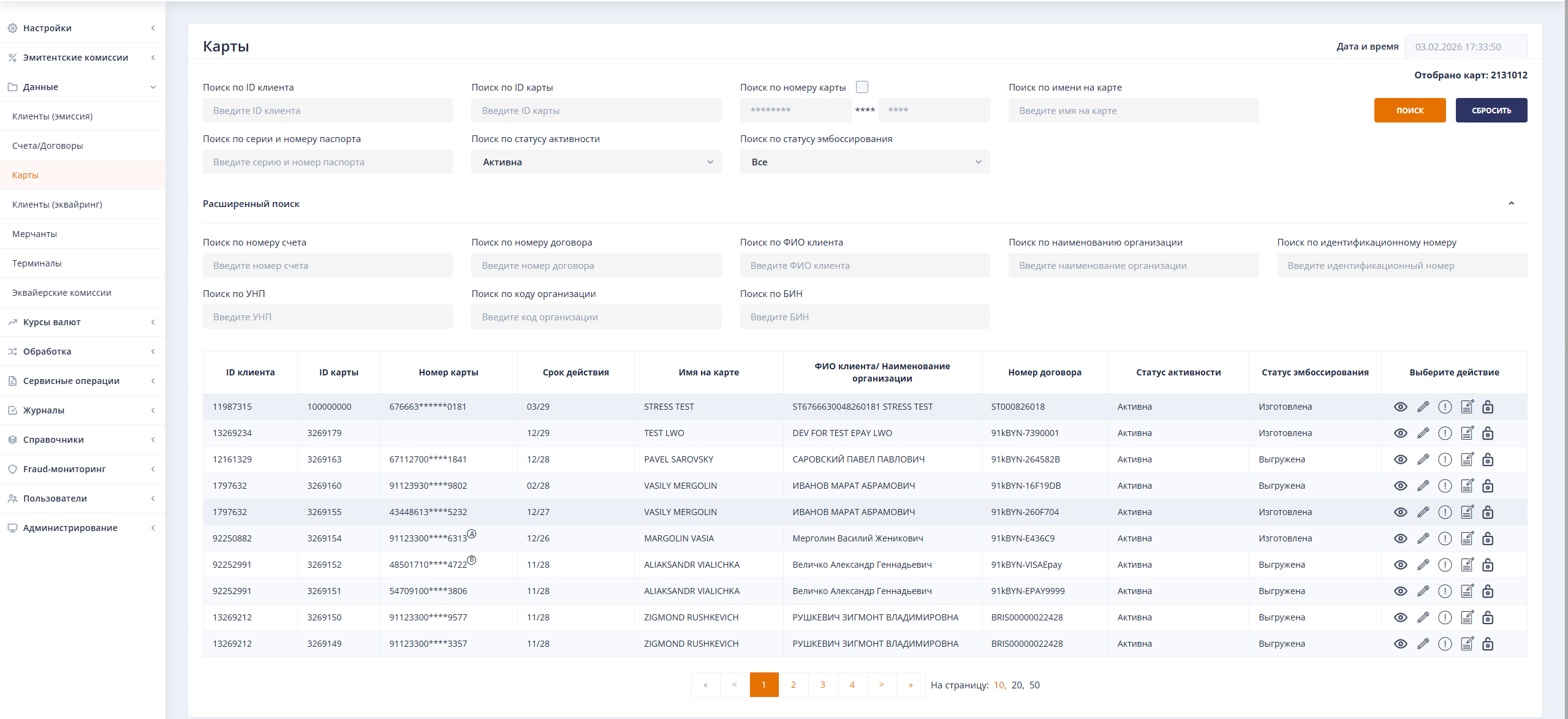 Поддержка всех типов карт (основных, дополнительных, корпоративных) и подготовка данных для эмбоссирования карт: автоматическая генерация номера карты, формирование EMV-параметров и осуществление обмена данными с модулем персонализации
