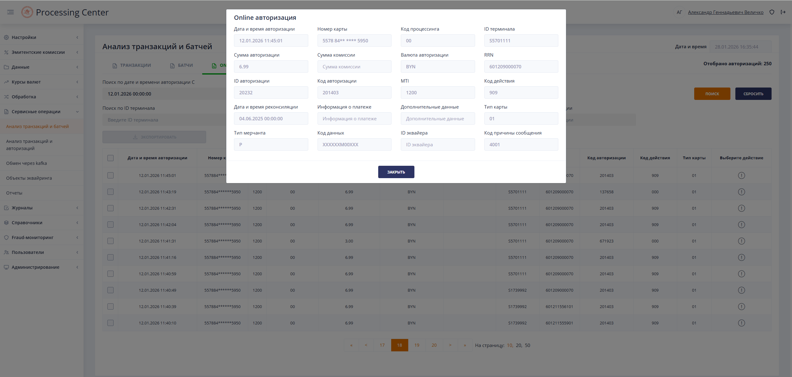 Автоматическая обработка входящего потока авторизационных запросов в формате ISO 8583 через REST API, включая одобренные и отказные транзакции. Конвертация сумм операций в унифицированную валюту (FAS-amount) для единообразия анализа