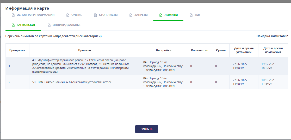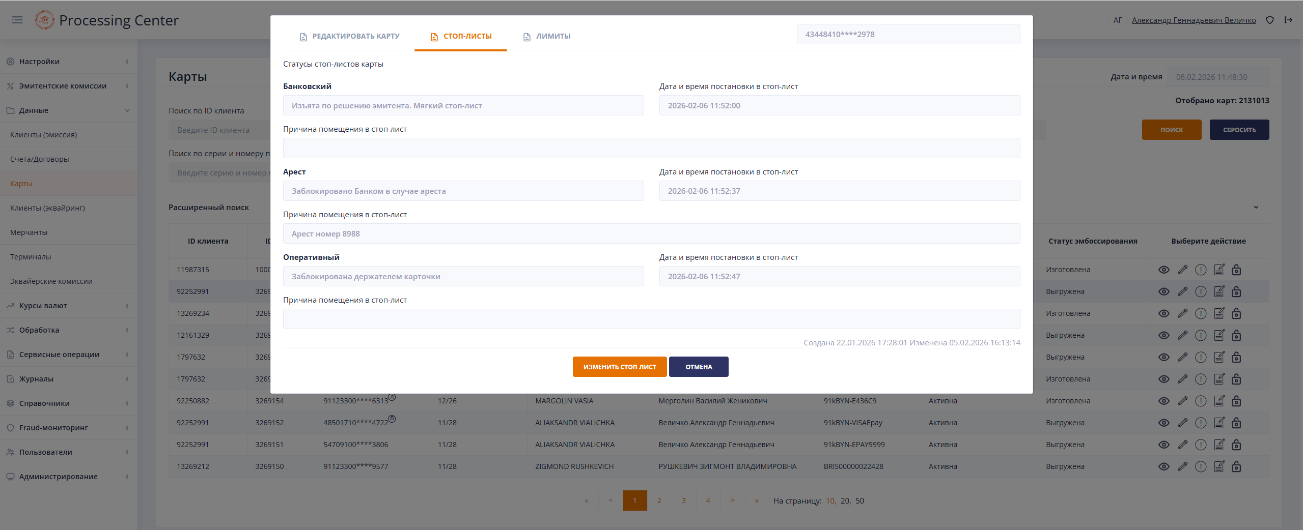 Обеспечение детального контроля операций через гибкую настройку запретов и лимитов для каждой карты, включая индивидуальные правила, настроенные клиентом, и осуществление моментальной проверки по актуальным онлайн стоп-листам и блэк-листам